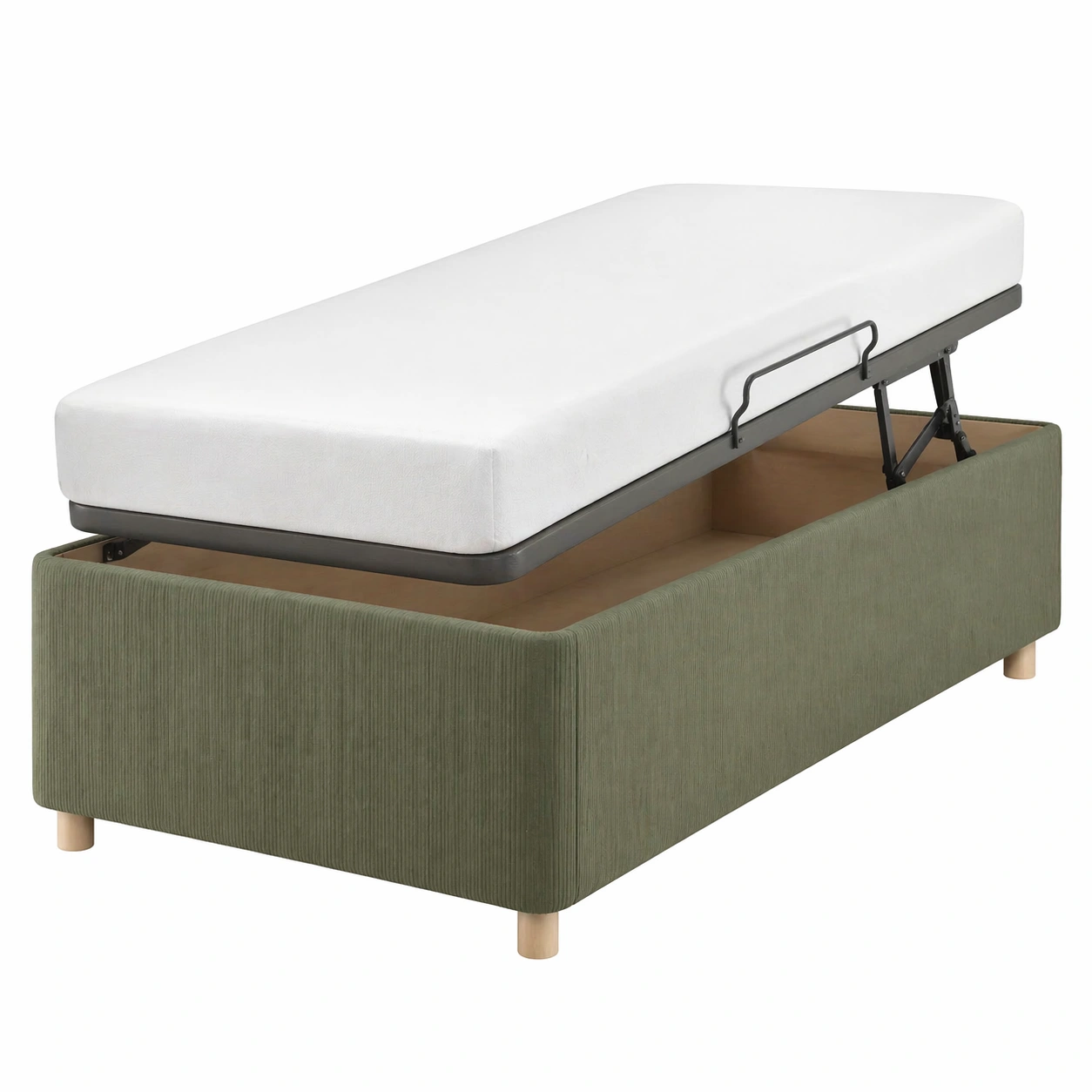 Cama individual tapizada con almacenamiento abatible en verde oliva, dise?o funcional 90x190 cm