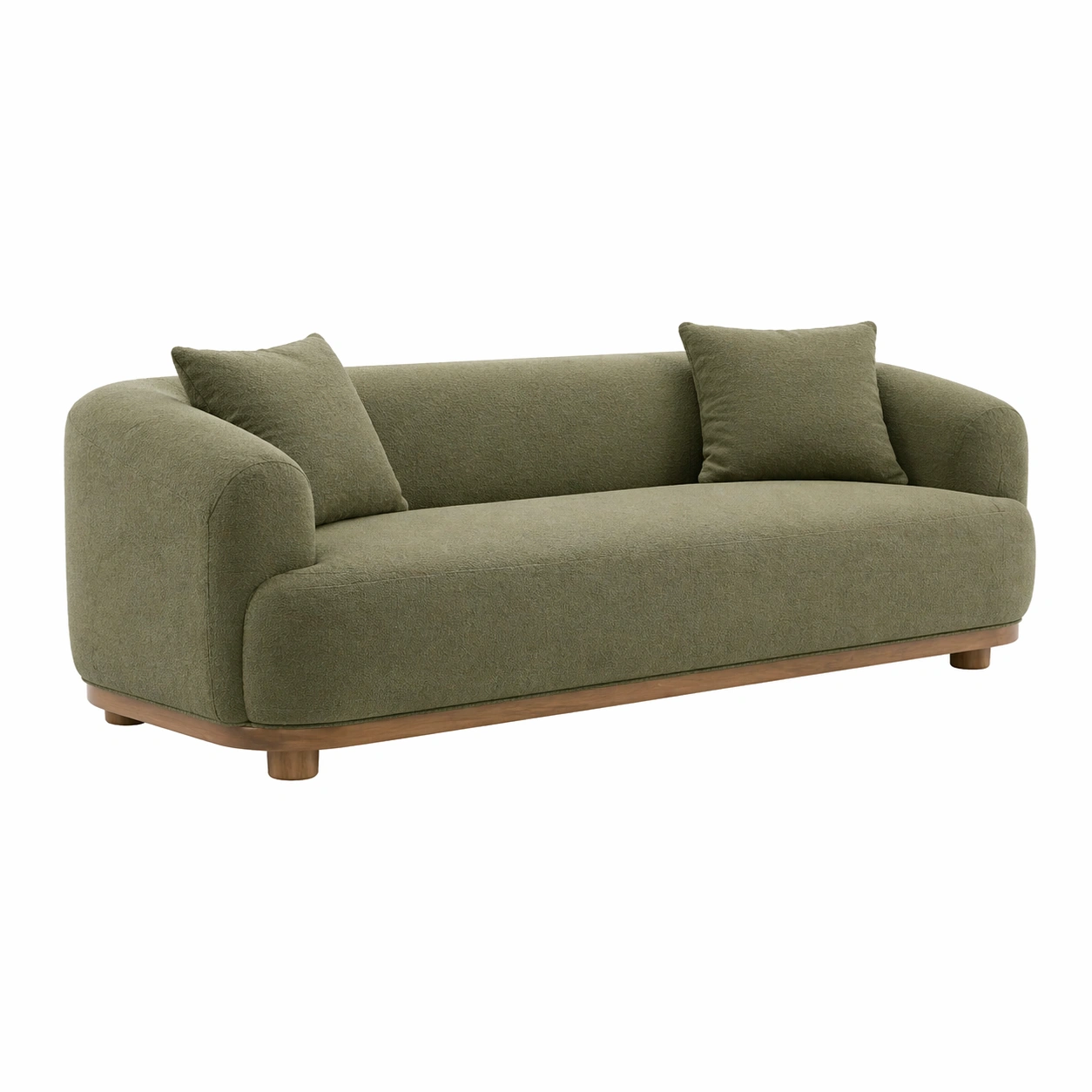 Sofá moderno tapizado en verde oliva con patas de madera natural