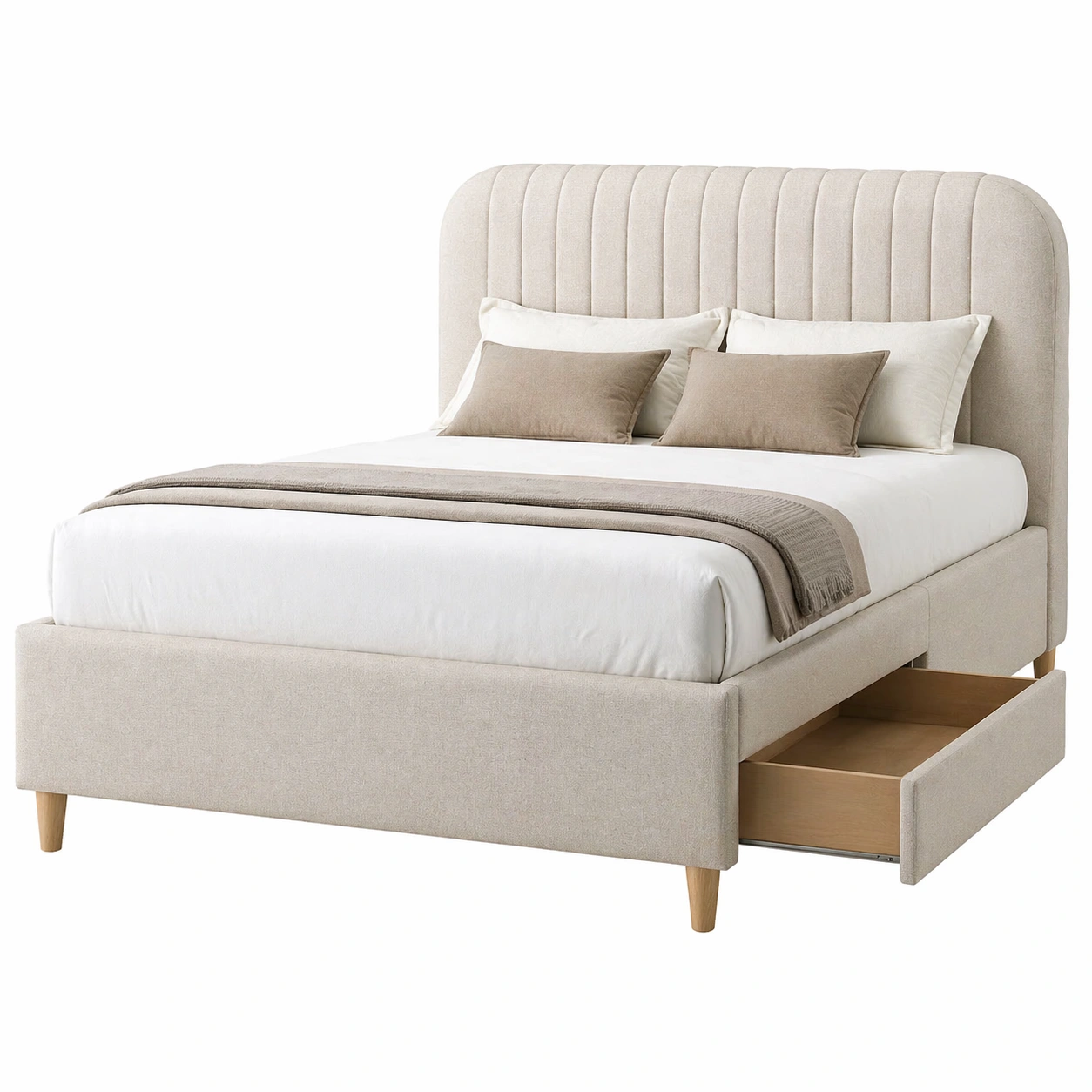 Descripción:Cama tapizada de dise?o moderno con estructura robusta y almacenamiento integrado en la base.