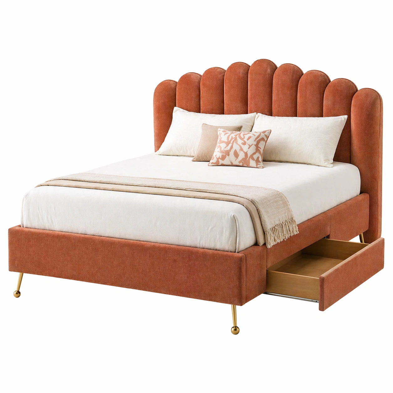 Descripción:Elegante cama tapizada con amplio espacio de almacenamiento integrado, ideal para dormitorios modernos. Su cabecero acolchado con dise?o curvo aporta un estilo sofisticado y acogedor. El acabado en color terracota a?ade calidez y personalidad al ambiente. Incluye cajón lateral deslizante perfecto para guardar ropa de cama u objetos personales. Estructura robusta y estable que combina funcionalidad y dise?o contemporáneo.