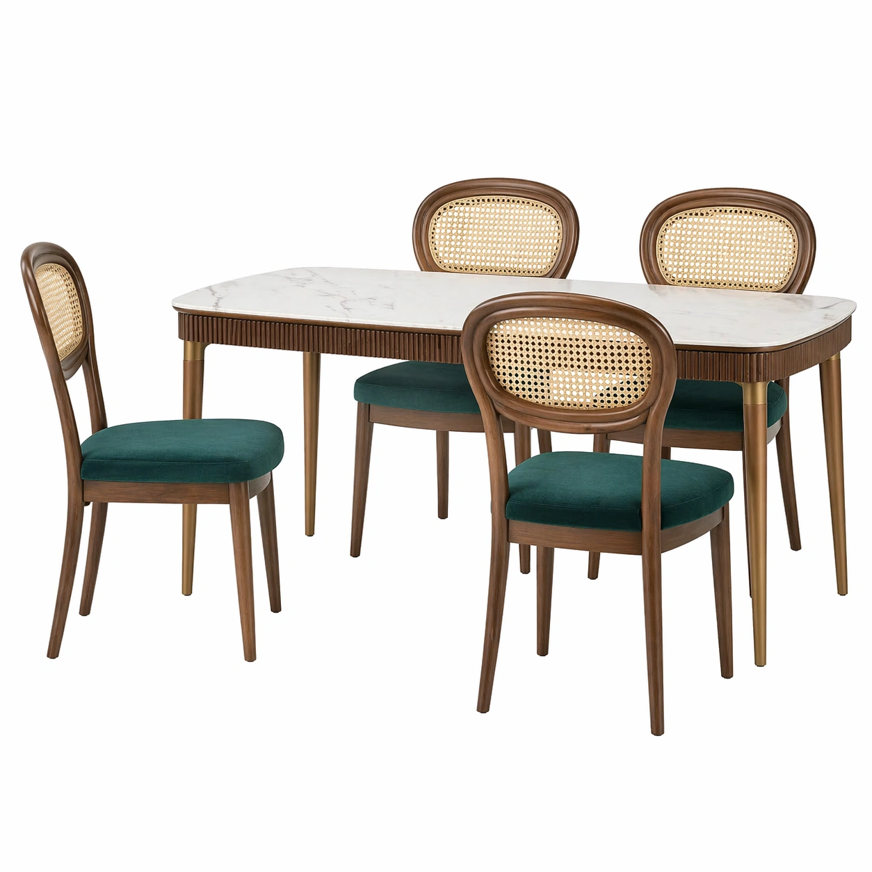 Descripción:Conjunto de comedor elegante y contemporáneo compuesto por una mesa de líneas suaves con acabado blanco tipo mármol y cuatro sillas con estructura de madera, respaldo de ratán trenzado y asiento acolchado en tela verde. Su dise?o combina estilo moderno con toques naturales, aportando calidez y sofisticación al espacio. Ideal para comedores, cocinas o espacios abiertos, ofrece comodidad, resistencia y un acabado visual de alta calidad.