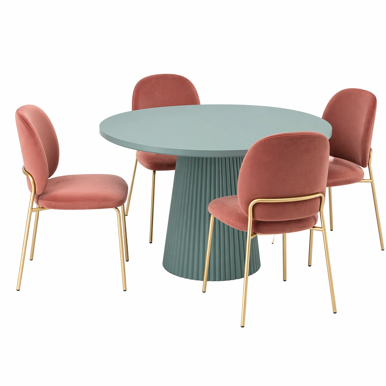 Descripción:Elegante conjunto de comedor con mesa redonda de dise?o contemporáneo y base central acanalada que aporta estabilidad y estilo. Incluye 4 sillas tapizadas en suave terciopelo con estructura metálica dorada, ofreciendo comodidad y un toque sofisticado. Ideal para comedores modernos o espacios compactos que buscan una estética actual y acogedora.