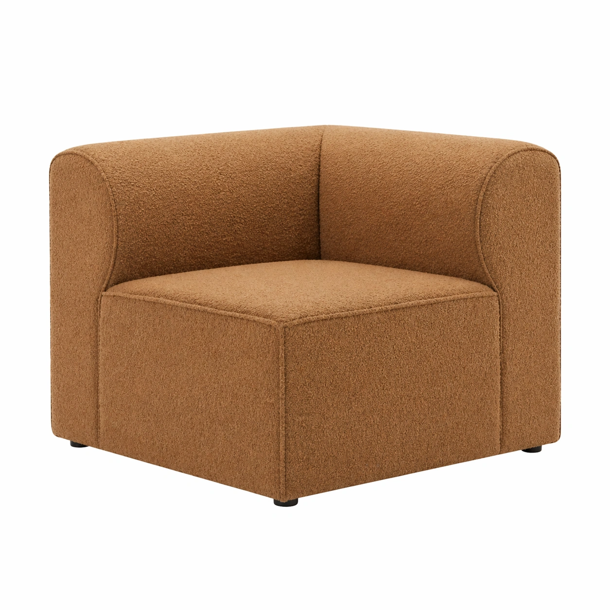 Este módulo esquinero destaca por su dise?o contemporáneo y su forma envolvente que optimiza el espacio en cualquier sala. Tapizado en una elegante tela bouclé de tono camel, aporta textura y calidez al ambiente. Su estructura firme combinada con un acolchado cómodo lo convierte en una pieza ideal para crear composiciones modulares modernas. Perfecto para salas peque?as o configuraciones personalizadas, este asiento es funcional, versátil y visualmente acogedor.